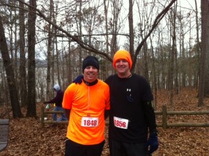 MF: Well, we didn’t give ourselves a whole lot of time to prepare for this thing… 35 days to be exact. First thing we did was sign up and pay our race fee (once that’s done, there is no backing out) We would do 1 long run every weekend and increase the mileage by 2 or 3 miles every week. We Started with what we were expecting to be a 5 mile trail run (being that the ½ marathon was on a trail, we did all of our long runs, on trails) the 5 miler turned in to a 4 miler and a lot of huffing, puffing, and complaining. Knowing that I have gotten shin splints in the past from running on treadmills and really running too much too soon I decided to ride the bike (stationary) and swim to help my cardio and not put as much stress on my legs. I figured, if I can train my body to perform at a high intensity for a long period of time (regardless of the activity) my breathing would not be a factor in the race. I typically did a spin class twice a week, swam once and got a leg workout in, throughout the week. Also rode the bike before and after a regular workout for nearly 30 minutes at a time. Also found later in my training that the stair master was a big help. Really helped strengthen my legs and prepared me for, what turned out to, some mountainous-like inclines during the race. After our 4 mile disastrous run, we decided not to focus nearly as much on speed but more so on, just getting the distance and letting the speed take care of itself. So the next weekend (1/21) we jumped up to a 7 mile run. Made a few wrong turns on some windy trails and ended up running 8 miles… what a pleasant surprise. The next weekend we tackled 10 miles and the weekend following, 12. With the race in 2 weeks we backed off to try and refresh the legs we had practically destroyed over a 1 month span and just ran 8 miles the weekend before the race. The week of the race came down to, do or die… give it up or give it hell… I chose to ride the bike with almost no resistance on Tuesday and Wednesday (week of) for about 30 minutes. I felt like it would be good to at least get some blood flowing and not completely neglect my legs for the week. By Saturday (race day) morning I was feeling as good as I had felt all month, anxious, excited, and actually a little nervous.